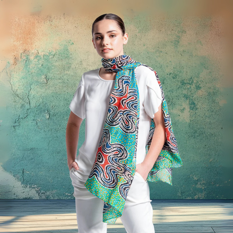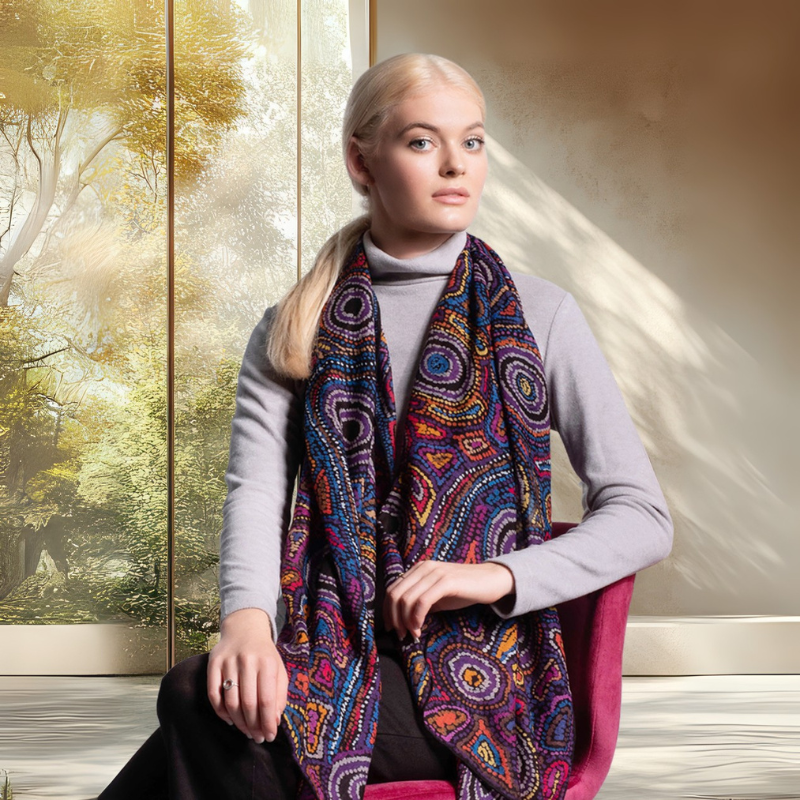 Wrap yourself in a story from the Dreamtime. Mainie scarves feature authentic Aboriginal Art designs on luxurious natural fabrics that add beauty and meaning to your style.